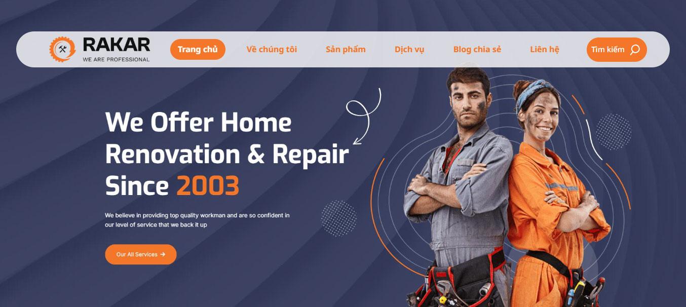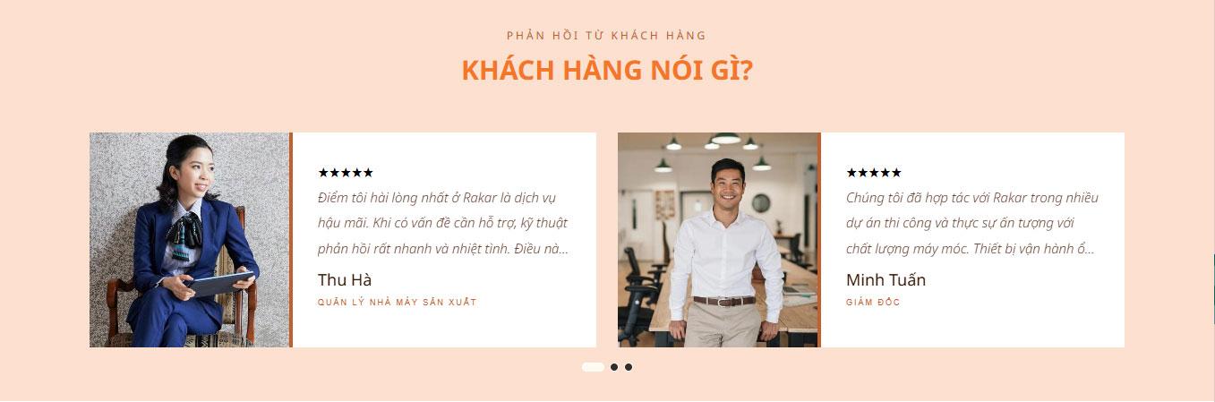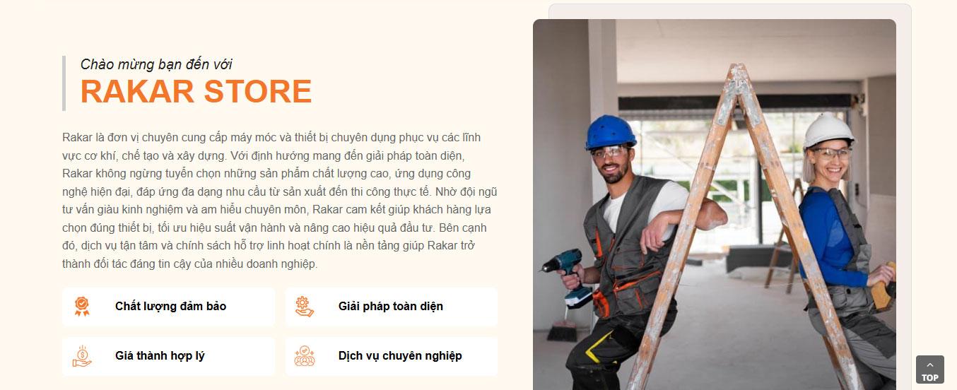 Website tích hợp khu vực Câu hỏi thường gặp (FAQ) tiện lợi bên cạnh hình ảnh kỹ thuật viên lành nghề, giúp giải đáp nhanh các thắc mắc về chính sách bảo hành và hỗ trợ kỹ thuật. Phần Blog "Tin tức công nghiệp Rakar" được thiết kế dạng thẻ (card) hiện đại, hỗ trợ người dùng cập nhật những xu hướng công nghệ chế tạo mới nhất và bí quyết vận hành máy móc hiệu quả.