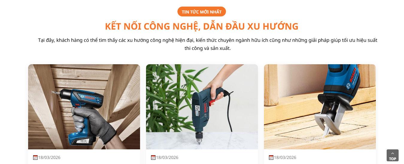 Phần sản phẩm nổi bật được trình bày dạng lưới (grid) 4 cột rõ ràng, hiển thị hình ảnh các loại máy móc sắc nét, tên model, giá bán và nút "Thêm vào giỏ hàng" màu đỏ đồng bộ. Cách bố trí khoa học với khoảng cách hợp lý giúp người dùng dễ dàng theo dõi thông số kỹ thuật và lựa chọn thiết bị phù hợp với quy mô sản xuất.