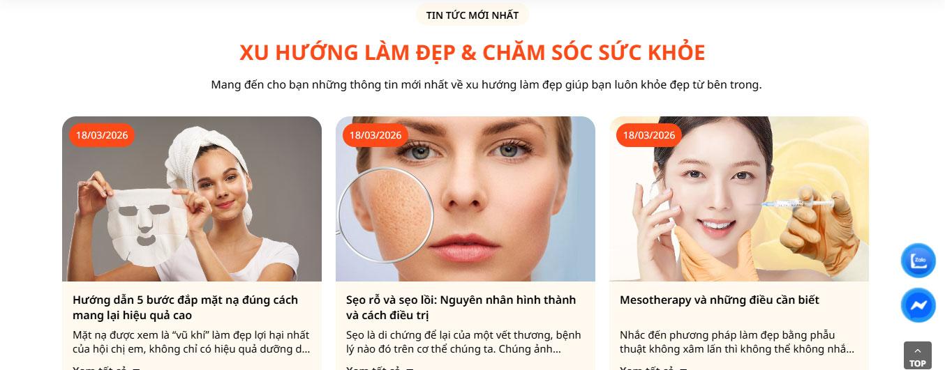 Website tích hợp khu vực Câu hỏi thường gặp (FAQ) tiện lợi bên cạnh hình ảnh chuyên viên tư vấn, giúp giải đáp nhanh các thắc mắc về quy trình và hiệu quả trị liệu. Phần Blog "Cẩm nang làm đẹp Sacha" được thiết kế dạng thẻ (card) hiện đại, hỗ trợ cập nhật những kiến thức chăm sóc da tại nhà và xu hướng thẩm mỹ mới nhất.