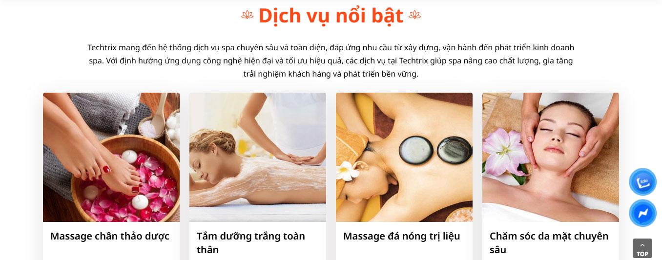 Phần dịch vụ nổi bật được trình bày dạng lưới (grid) 4 cột rõ ràng, hiển thị hình ảnh các liệu trình như chăm sóc da mặt, massage body, trị liệu chuyên sâu kèm theo mức giá minh bạch và nút "Đặt lịch ngay" màu nâu đồng bộ. Cách bố trí khoa học giúp người dùng dễ dàng lướt xem danh mục dịch vụ và lựa chọn giải pháp chăm sóc phù hợp.