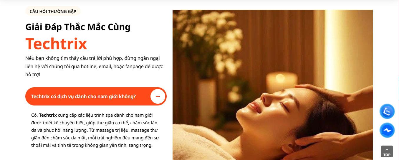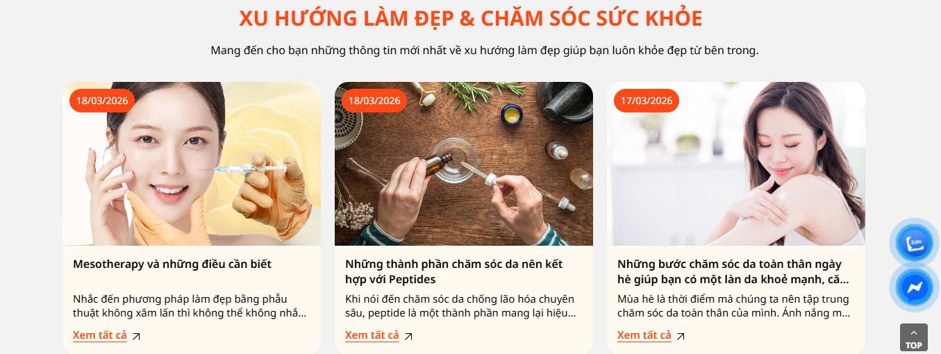 Website tích hợp khu vực Câu hỏi thường gặp (FAQ) tiện lợi bên cạnh hình ảnh chuyên viên tư vấn, giúp giải đáp nhanh các thắc mắc về quy trình và hiệu quả trị liệu. Phần Blog "Cẩm nang làm đẹp Sacha" được thiết kế dạng thẻ (card) hiện đại, hỗ trợ cập nhật những kiến thức chăm sóc da tại nhà và xu hướng thẩm mỹ mới nhất.