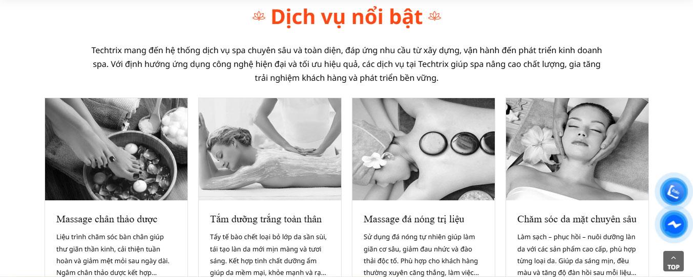 Phần dịch vụ nổi bật được trình bày dạng lưới (grid) 4 cột rõ ràng, hiển thị hình ảnh các liệu trình như chăm sóc da mặt, massage body, trị liệu chuyên sâu kèm theo mức giá minh bạch và nút "Đặt lịch ngay" màu nâu đồng bộ. Cách bố trí khoa học giúp người dùng dễ dàng lướt xem danh mục dịch vụ và lựa chọn giải pháp chăm sóc phù hợp.