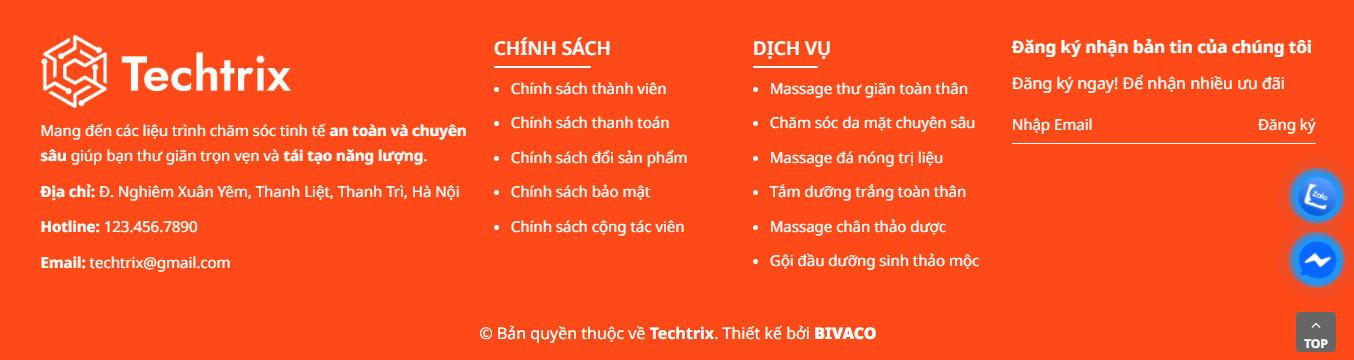 Cuối trang là form "Đăng ký tư vấn liệu trình" với các ô nhập liệu rõ ràng trên nền màu nhã nhặn, giúp tăng tỷ lệ tương tác và hỗ trợ khách hàng kịp thời. Footer được sắp xếp khoa học với đầy đủ thông tin liên hệ, logo các đối tác uy tín và liên kết chính sách, đảm bảo tính thẩm mỹ và dễ dàng điều hướng cho người dùng.