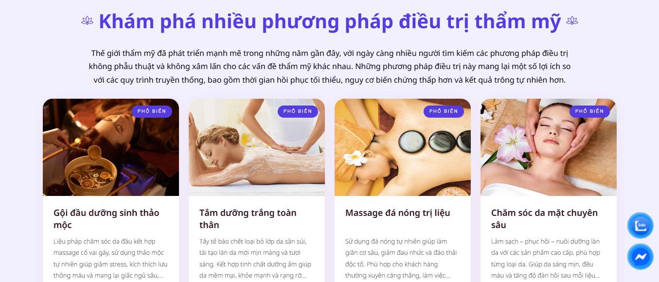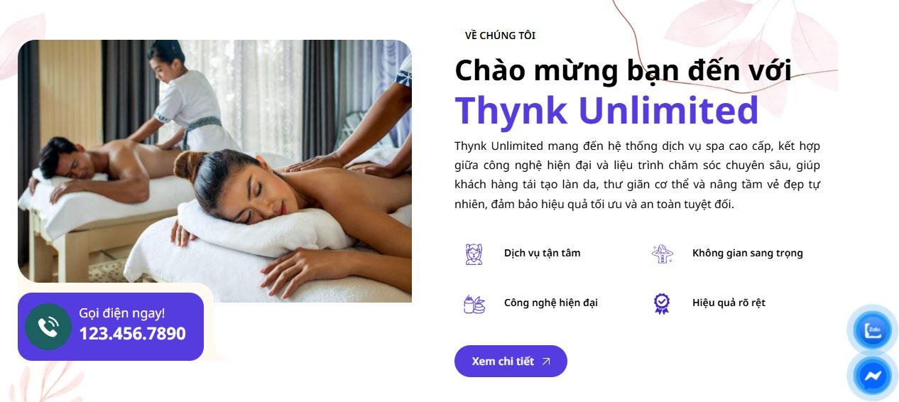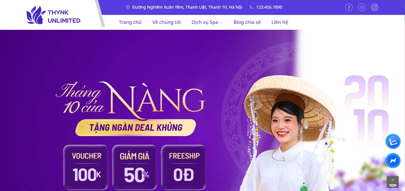 Giao diện website sử dụng tông màu tím kết hợp cùng nền trắng thanh lịch, tạo nên một không gian trực quan đậm chất "Wellness" và sự thư thái. Banner đầu trang nổi bật với hình ảnh người mẫu đang tận hưởng liệu trình spa cùng thông điệp, khẳng định vị thế là điểm đến lý tưởng để tái tạo năng lượng ngay khi khách hàng truy cập.