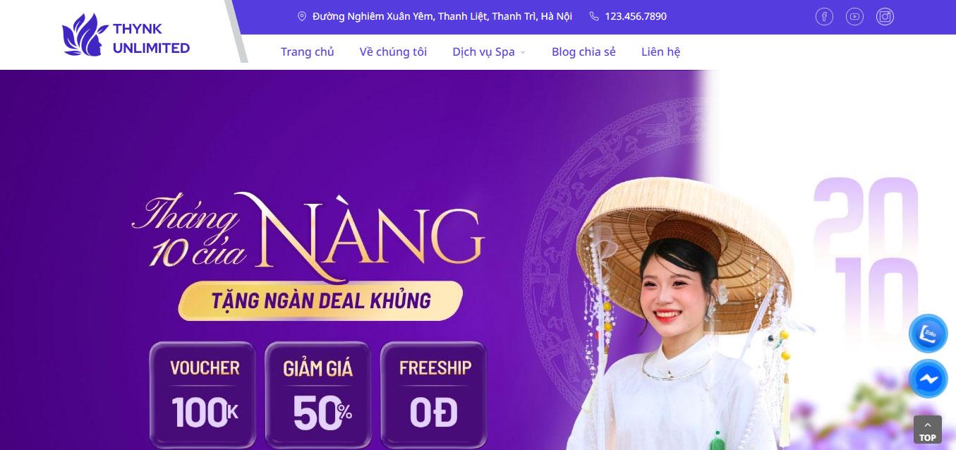 Giao diện website sử dụng tông màu tím kết hợp cùng nền trắng thanh lịch, tạo nên một không gian trực quan đậm chất "Wellness" và sự thư thái. Banner đầu trang nổi bật với hình ảnh người mẫu đang tận hưởng liệu trình spa cùng thông điệp, khẳng định vị thế là điểm đến lý tưởng để tái tạo năng lượng ngay khi khách hàng truy cập.