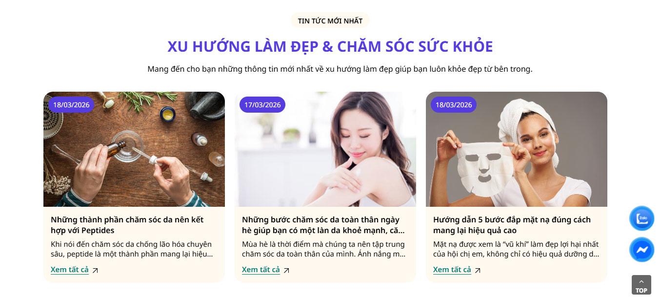 Website tích hợp khu vực Câu hỏi thường gặp (FAQ) tiện lợi bên cạnh hình ảnh chuyên viên tư vấn, giúp giải đáp nhanh các thắc mắc về quy trình và hiệu quả trị liệu. Phần Blog "Cẩm nang làm đẹp Sacha" được thiết kế dạng thẻ (card) hiện đại, hỗ trợ cập nhật những kiến thức chăm sóc da tại nhà và xu hướng thẩm mỹ mới nhất.