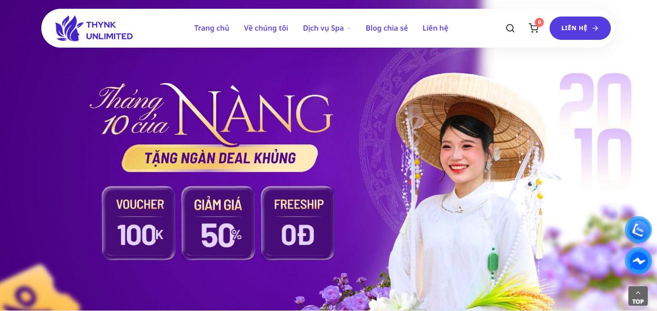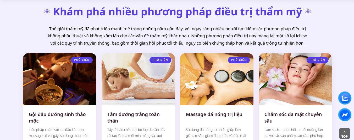 Giao diện website sử dụng tông màu tím kết hợp cùng nền trắng thanh lịch, tạo nên một không gian trực quan đậm chất "Wellness" và sự thư thái. Banner đầu trang nổi bật với hình ảnh người mẫu đang tận hưởng liệu trình spa cùng thông điệp "Beauty Clinic For You", khẳng định vị thế là điểm đến lý tưởng để tái tạo năng lượng ngay khi khách hàng truy cập.