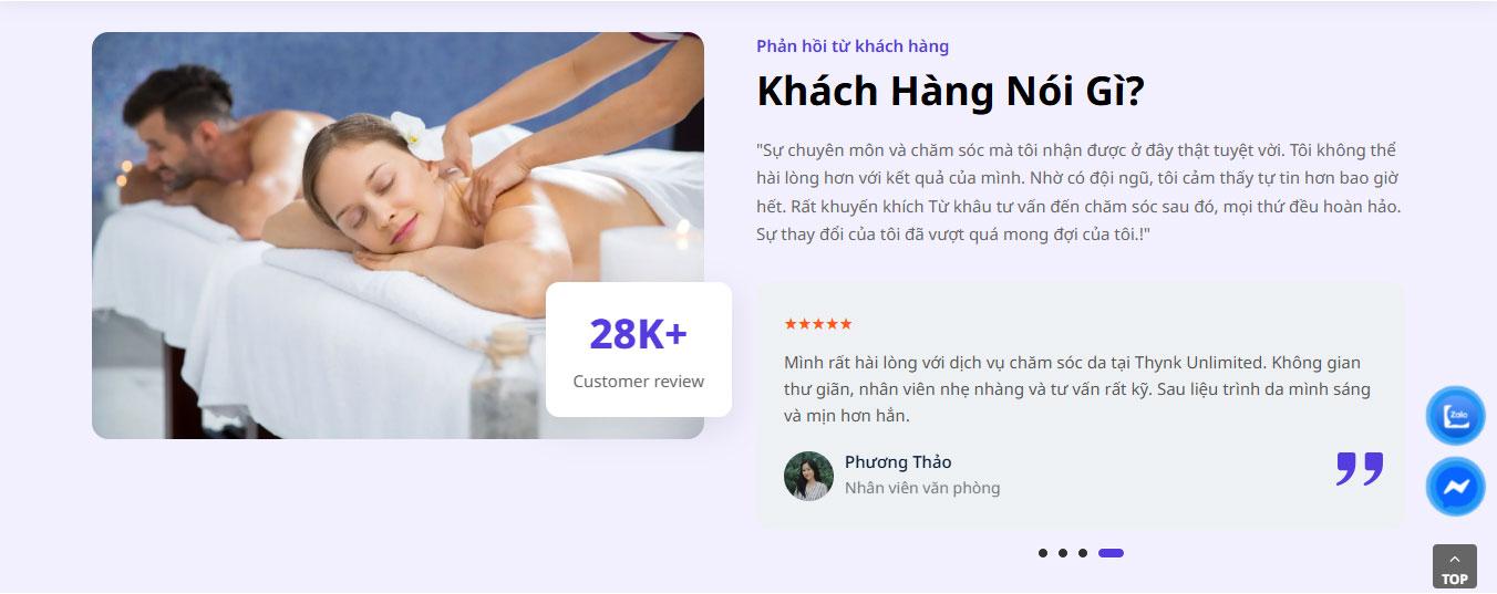 Khu vực giá trị cốt lõi "Vẻ đẹp & Sự tận tâm" được thể hiện qua bố cục khung hình oval nghệ thuật và các dòng liệt kê ưu điểm về phương pháp trị liệu an toàn và dược mỹ phẩm cao cấp. Tiếp sau đó là khối phản hồi khách hàng (Testimonials) trên nền màu nâu đậm, tạo điểm nhấn mạnh mẽ và gia tăng độ uy tín thông qua những đánh giá thực tế từ người trải nghiệm.