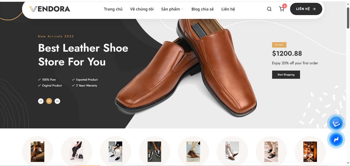 Phần đầu trang nổi bật với banner lớn hiển thị hình ảnh sản phẩm giày da chất lượng cao, được đặt trong một bố cục rộng rãi, tinh giản nhưng rất thu hút. Nội dung trên banner được trình bày ngắn gọn, súc tích với thông điệp rõ ràng, đi kèm giá bán và ưu đãi, giúp người dùng nhanh chóng nắm bắt thông tin quan trọng mà không cần phải tìm kiếm nhiều. Khu vực điều hướng phía trên được thiết kế gọn gàng với các mục quen thuộc như trang chủ, sản phẩm, blog và liên hệ, kết hợp cùng biểu tượng giỏ hàng và nút liên hệ giúp tăng tính tiện lợi trong quá trình mua sắm.
