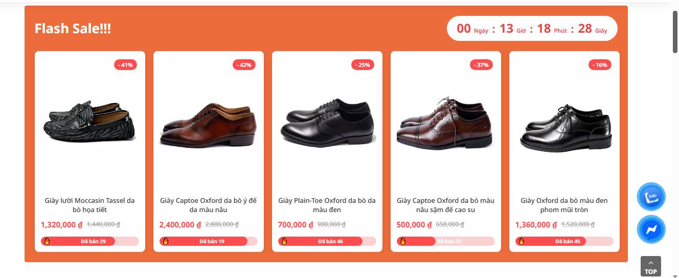 Ngay bên dưới là khu vực danh mục sản phẩm được thể hiện bằng các icon hình tròn cùng hình ảnh minh họa trực quan, tạo cảm giác thân thiện và dễ sử dụng. Người dùng có thể nhanh chóng nhận diện từng loại giày như giày tây, giày lười, sandal hay phụ kiện mà không mất nhiều thời gian. Tiếp theo là khu vực Flash Sale được thiết kế nổi bật với nền màu cam đặc trưng, tạo điểm nhấn thị giác mạnh mẽ. Các sản phẩm trong phần này được trình bày rõ ràng với hình ảnh sắc nét, giá cũ – giá mới và phần trăm giảm giá nổi bật, kết hợp thêm đồng hồ đếm ngược giúp kích thích tâm lý mua hàng nhanh chóng, từ đó nâng cao tỷ lệ chuyển đổi.