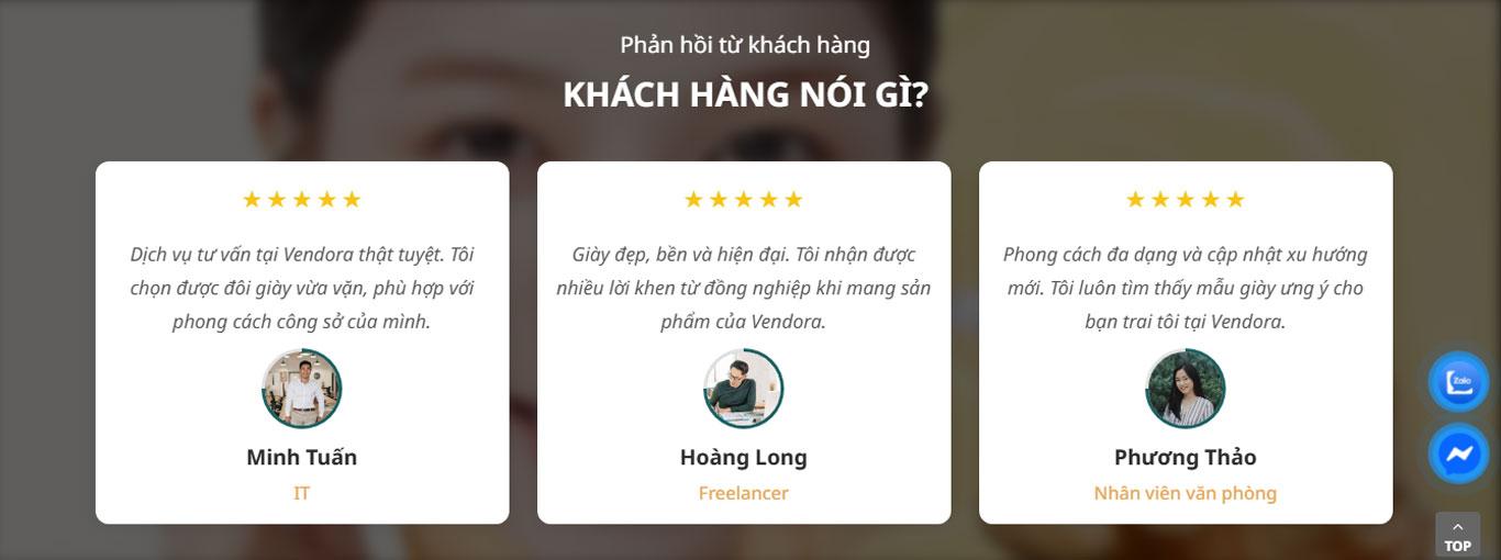 Không dừng lại ở việc bán hàng, giao diện Vendora còn chú trọng xây dựng niềm tin thông qua phần đánh giá khách hàng. Những phản hồi tích cực được hiển thị kèm hình ảnh đại diện giúp tăng tính chân thực và tạo hiệu ứng lan tỏa, khiến người dùng mới cảm thấy yên tâm hơn khi quyết định mua sắm. Bên cạnh đó, khu vực blog với chủ đề về xu hướng thời trang giày nam, cách phối đồ và bảo quản giày không chỉ mang lại giá trị thông tin mà còn góp phần giữ chân người dùng lâu hơn trên website, đồng thời hỗ trợ tốt cho chiến lược SEO.