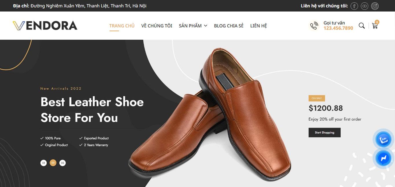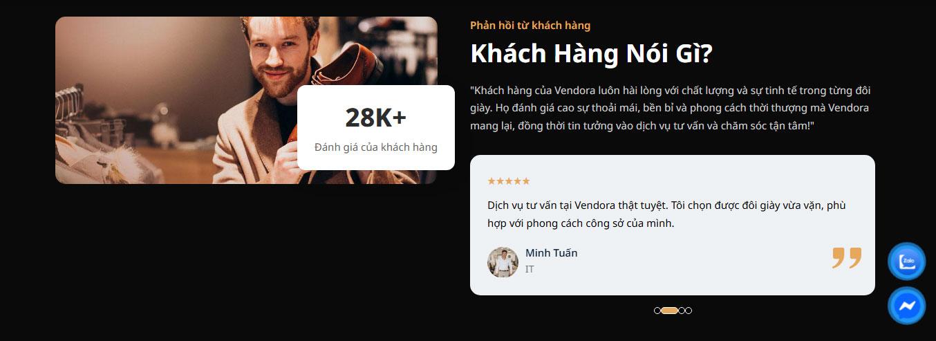 Bên cạnh đó, giao diện còn tích hợp các nút liên hệ nhanh như Zalo và Messenger được đặt nổi ở cạnh màn hình, giúp người dùng có thể dễ dàng kết nối với cửa hàng bất cứ lúc nào. Tính năng này đặc biệt hữu ích trong việc hỗ trợ tư vấn nhanh, giải đáp thắc mắc và nâng cao trải nghiệm dịch vụ khách hàng. Sự kết hợp giữa yếu tố thẩm mỹ và tính năng tiện ích đã giúp giao diện Vendora không chỉ đẹp mắt mà còn rất thực tế trong quá trình sử dụng.