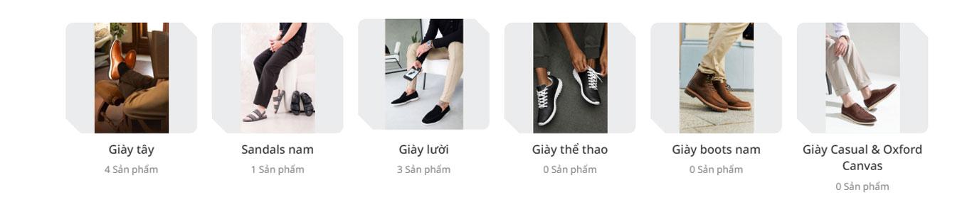 Ngay bên dưới banner là khu vực danh mục sản phẩm được thiết kế trực quan với hình ảnh minh họa sinh động, giúp người dùng dễ dàng phân biệt và lựa chọn giữa các dòng sản phẩm như giày tây hay sandals nam. Việc hiển thị số lượng sản phẩm trong từng danh mục cũng góp phần cung cấp thêm thông tin hữu ích, giúp khách hàng nhanh chóng định hướng được nhu cầu mua sắm của mình. Bố cục dạng khối với khoảng cách hợp lý giữa các phần tử giúp giao diện trở nên thông thoáng, dễ nhìn và không gây cảm giác rối mắt.