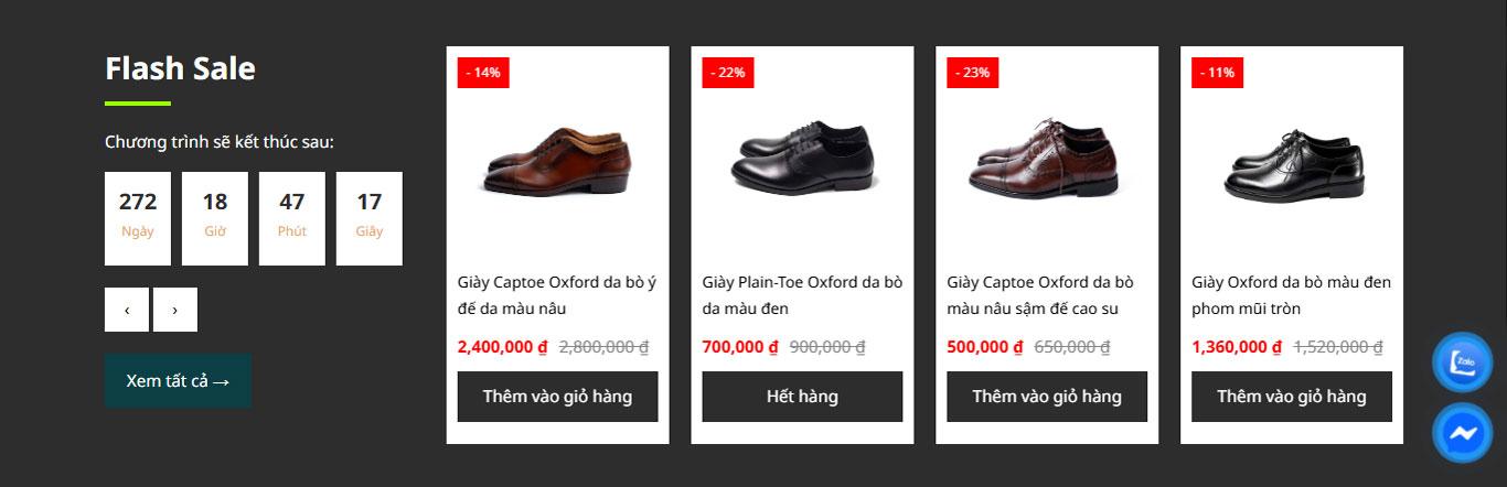 Điểm nhấn tiếp theo của giao diện là khu vực Flash Sale, được thiết kế với nền tối nhằm tạo sự tương phản rõ rệt so với các phần còn lại của trang. Bộ đếm thời gian hiển thị chi tiết theo ngày, giờ, phút và giây không chỉ giúp người dùng nắm bắt thời gian khuyến mãi mà còn tạo cảm giác cấp bách, thúc đẩy hành vi mua hàng nhanh chóng. Đây là một yếu tố quan trọng trong các website thương mại điện tử, giúp tăng tỷ lệ chuyển đổi bằng cách kích thích tâm lý “sợ bỏ lỡ” của khách hàng.
